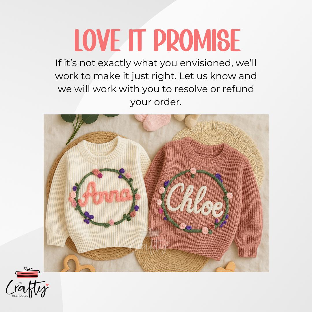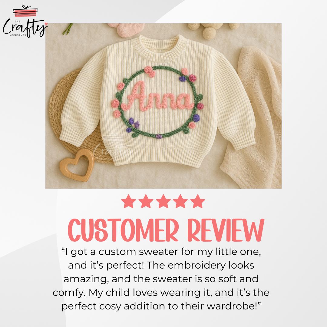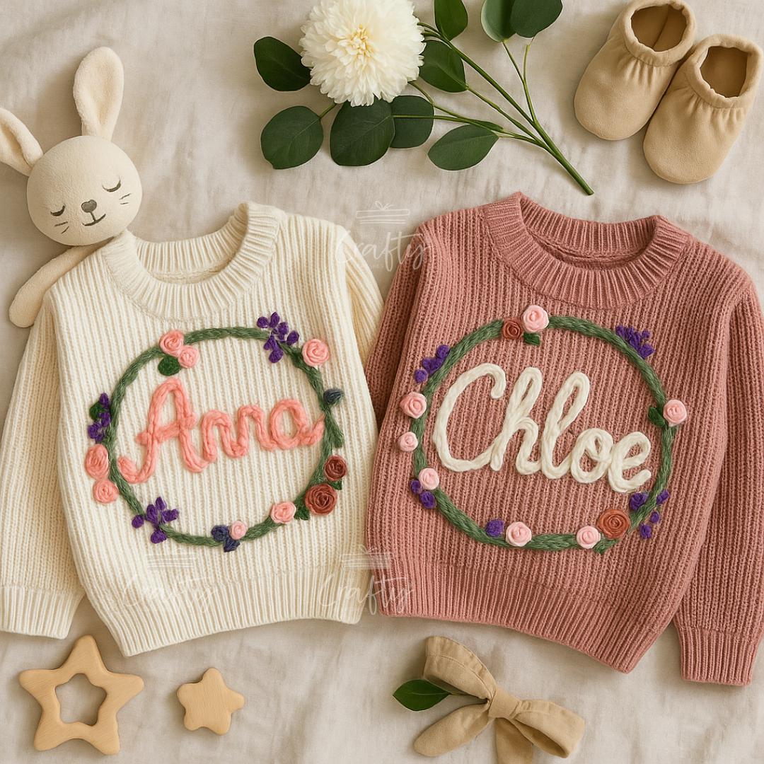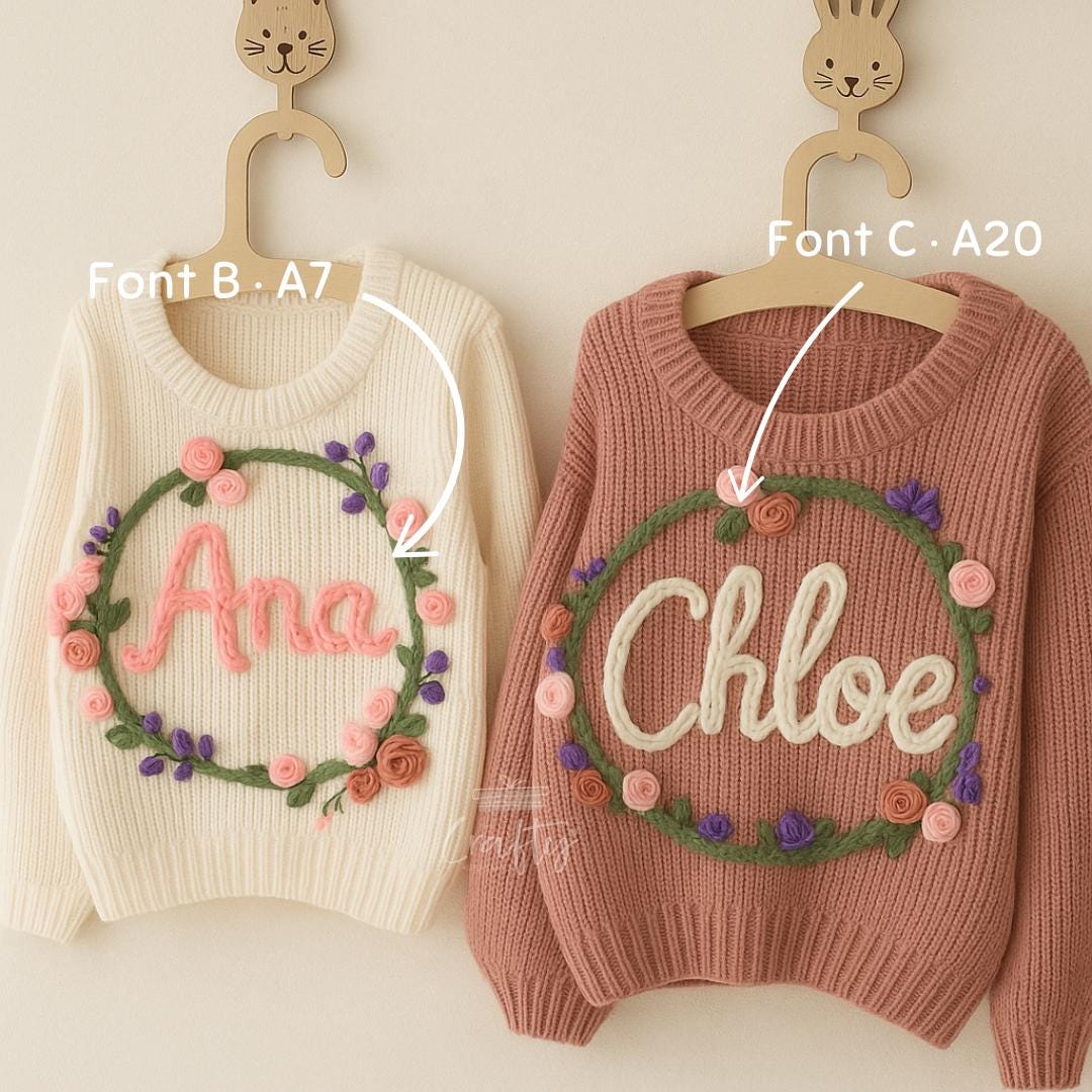 Hand-Embroidered Name with Floral Wreath Wrap your little one in warmth and whimsy with our beautifully handcrafted Custom Baby & Toddler Sweater, featuring a lovingly stitched name framed by a floral wreath. This design is perfect for birthdays, family photos, or as a heartfelt gift that will be treasured for years to come.